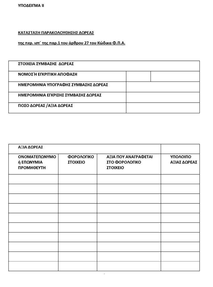 συντάσσει και διαφυλάσσει «ΚΑΤΑΣΤΑΣΗ ΠΑΡΑΚΟΛΟΥΘΗΣΗΣ ΔΩΡΕΑΣ» της περ. ιστ' της παρ. 1 του άρθρου 27 του Κώδικα Φ.Π.Α., όπως